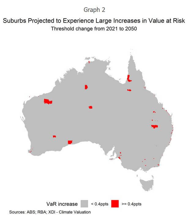 According to a Reserve Bank (RBA) research paper, about 3.5% of Australian properties are currently considered to be at ‘high risk’ from climate change.5 To come to this conclusion, the RBA used an indicator called the ‘Value at Risk’ (VaR) – the VaR measures the expected annual cost of climate change-related damage relative to the replacement cost of the property. It essentially measures insurance premiums.