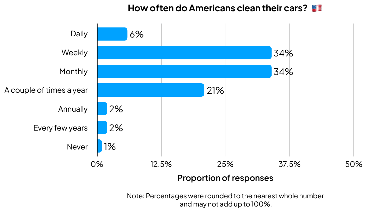Of those surveyed, most car owners said they would clean their vehicles monthly, weekly, and a couple of times a year across Australia, the United States and Canada.