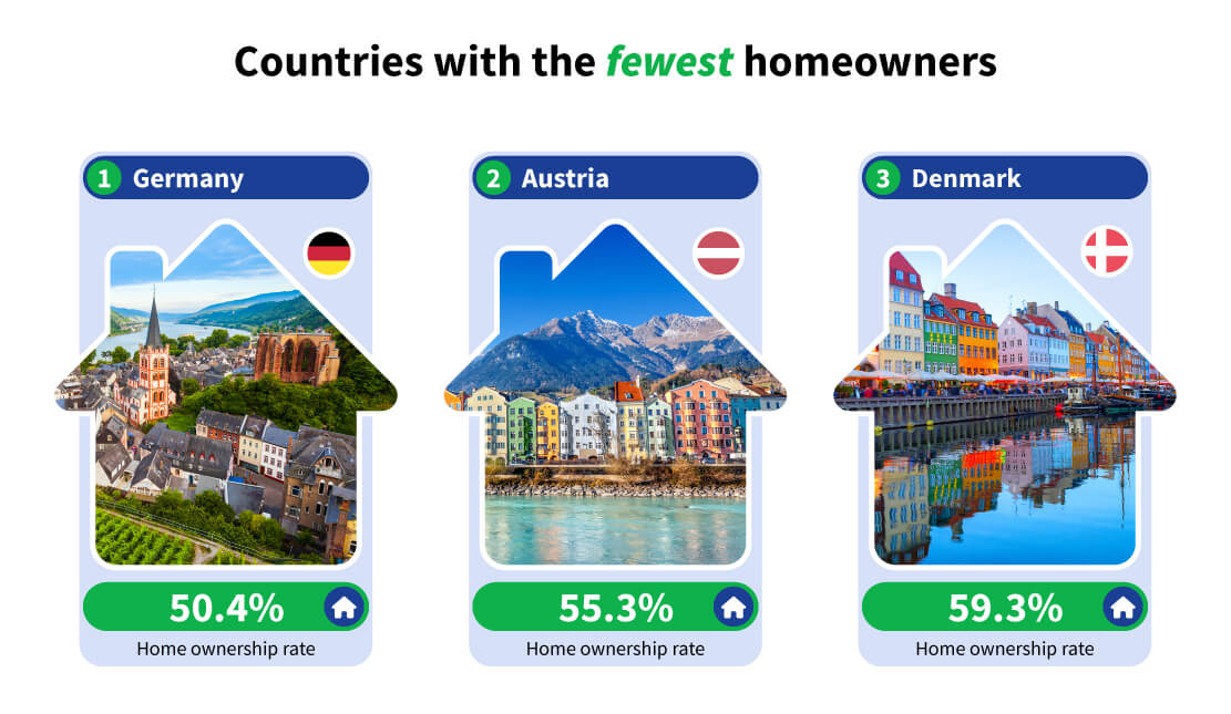 Germany’s neighbours in Austria have the second-lowest home ownership rate on the continent, at just 55.3%.
