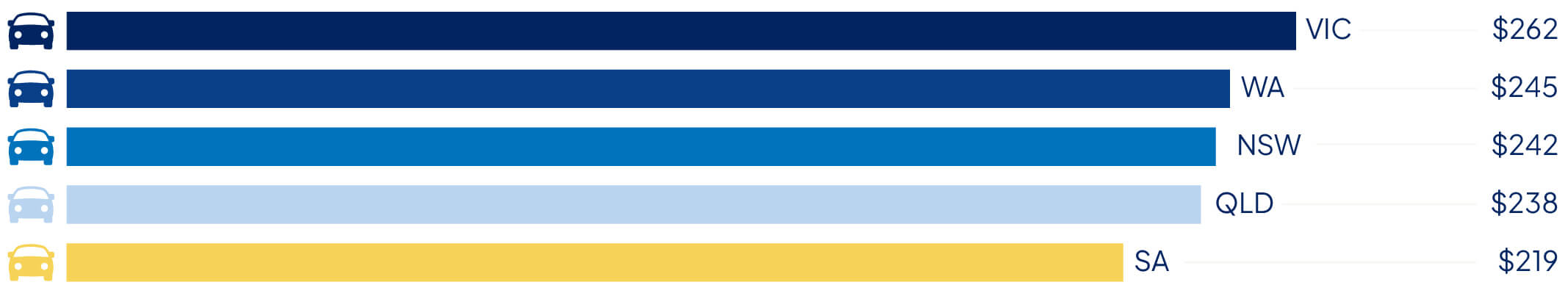 The cost of annual registration and compulsory third-party insurance (CTP) in Queensland for a private use vehicle was sourced from the Queensland Department of Transport and Main Roads during the 2024-25 financial year. A cheaper fee applies for full electric vehicles and models with three cylinders or fewer.